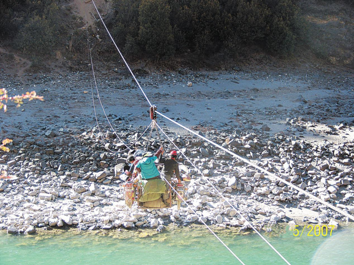 ▲一根鋼絲繩,一個吊籃,將項目建設物資運送過雅礱江