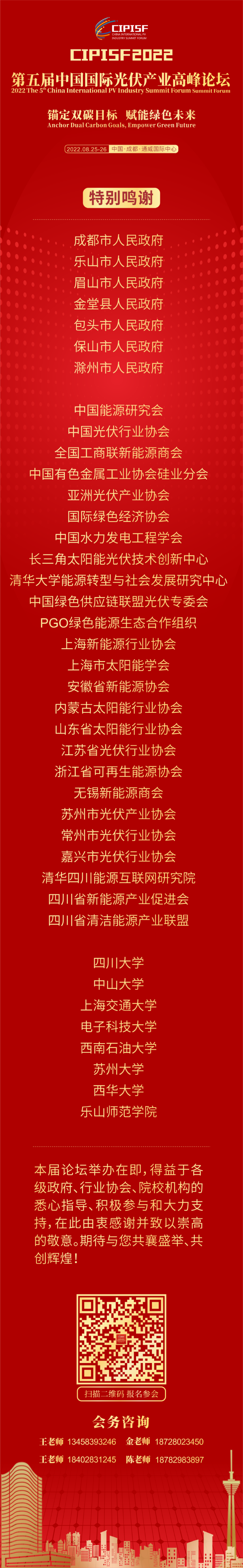 作為中國(guó)光伏行業(yè)的頂級(jí)年度盛事,2022第五屆中國(guó)國(guó)際光伏產(chǎn)業(yè)高峰論壇即將于8月25日-8月26日在成都通威國(guó)際中心盛大啟幕。本次論壇吸引了來(lái)自中央、省、市各級(jí)政府重要領(lǐng)導(dǎo)、26個(gè)頂級(jí)行業(yè)協(xié)會(huì)匯聚一堂,圍繞“錨定雙碳目標(biāo) 賦能綠色未來(lái)”的大會(huì)主題展開(kāi)深度探討。聚焦行業(yè)前沿,共謀行業(yè)綠色轉(zhuǎn)型和長(zhǎng)遠(yuǎn)發(fā)展,展開(kāi)智慧碰撞,展示前沿成果,全力助推中國(guó)光伏產(chǎn)業(yè)高質(zhì)量發(fā)展。