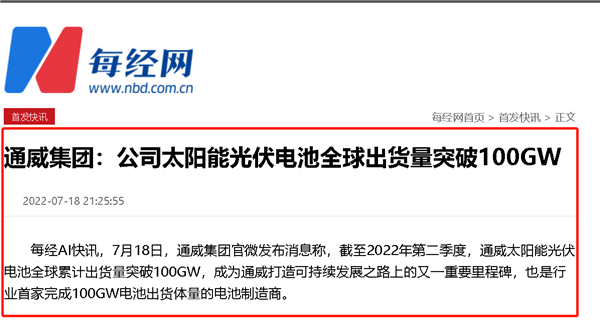報道指出,“截至2022年第二季度,通威太陽能光伏電池全球累計出貨量突破100GW,成為全球光伏行業中,首家完成100GW電池出貨體量的電池制造商。”報道重點關注了通威太陽能2022年第二季度生產成績,對通威太陽能光伏電池全球出貨量突破100GW的傲人成績表示了高度肯定。