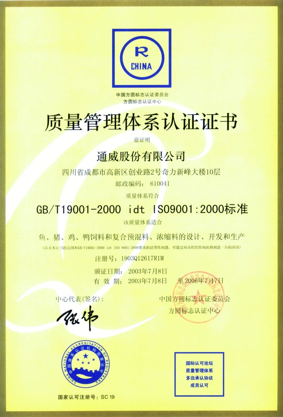 ▲1997年,通威集團(tuán)在中國(guó)飼料行業(yè)首家通過(guò)ISO—9002質(zhì)量體系認(rèn)證和產(chǎn)品方圓認(rèn)證