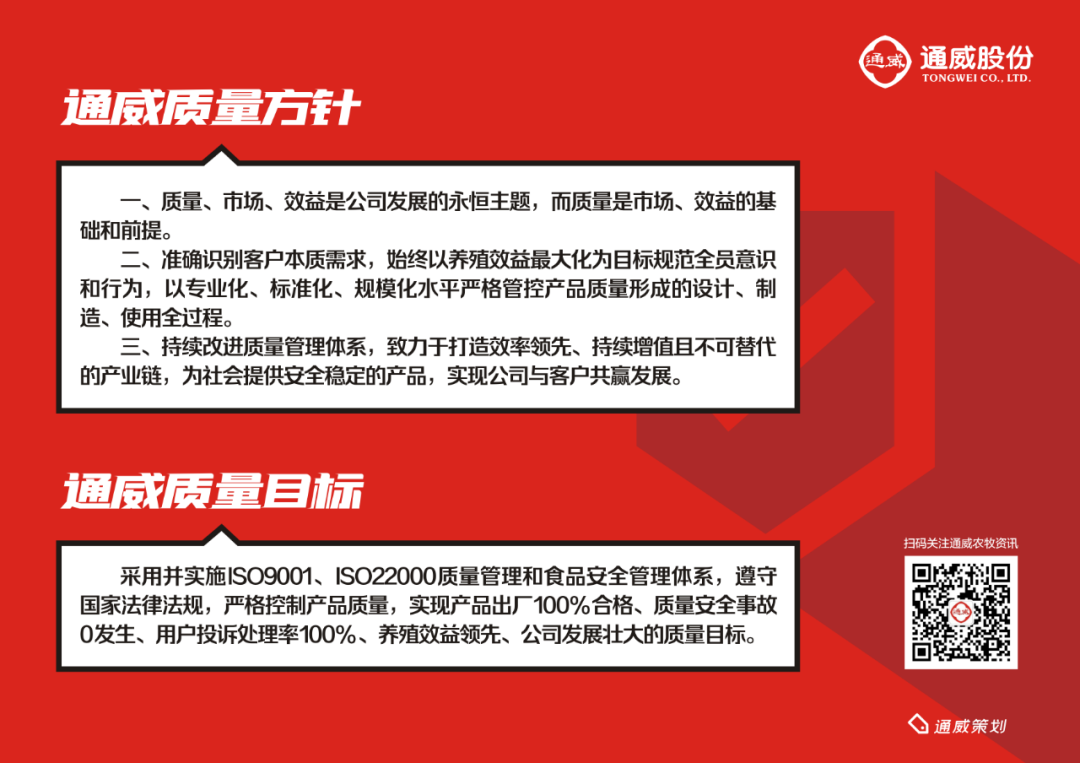 2021年,通威“質(zhì)量方針”落地一年多,劉漢元主席6天行程1000余公里,視察了無(wú)錫、南通、大豐、連云港、淮安、揚(yáng)州等地8家通威農(nóng)牧生產(chǎn)基地,查看原料品質(zhì)、詢問(wèn)設(shè)備運(yùn)行、了解生產(chǎn)管理的整頓改造細(xì)節(jié)、慰問(wèn)一線員工。視察期間,劉漢元主席評(píng)價(jià)道,通威農(nóng)牧上下將“質(zhì)量方針”內(nèi)化于心、外化于行,真正發(fā)自內(nèi)心認(rèn)同,并在行動(dòng)上化被動(dòng)為主動(dòng)。這兩年比前幾年做得更好,相信會(huì)越來(lái)越好。