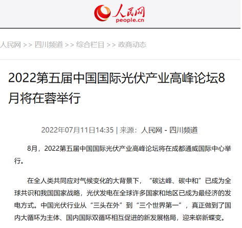 人民網(wǎng)聚焦2022第五屆中國(guó)國(guó)際光伏產(chǎn)業(yè)高峰論壇