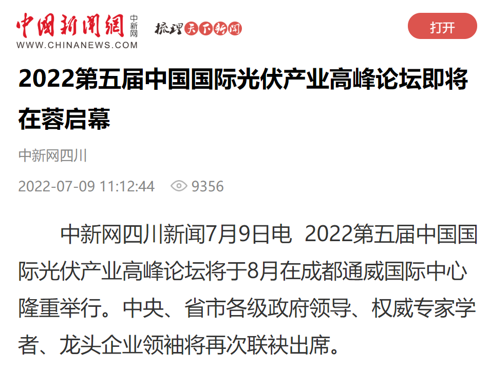 7月9日,中新網(wǎng)以《2022第五屆中國(guó)國(guó)際光伏產(chǎn)業(yè)高峰論壇即將在蓉啟幕》聚焦本次論壇。報(bào)道指出,中國(guó)國(guó)際光伏產(chǎn)業(yè)高峰論壇匯聚高端“智囊團(tuán)”,凝聚綠色發(fā)展共識(shí),獲得了社會(huì)各界的廣泛認(rèn)可和好評(píng)。