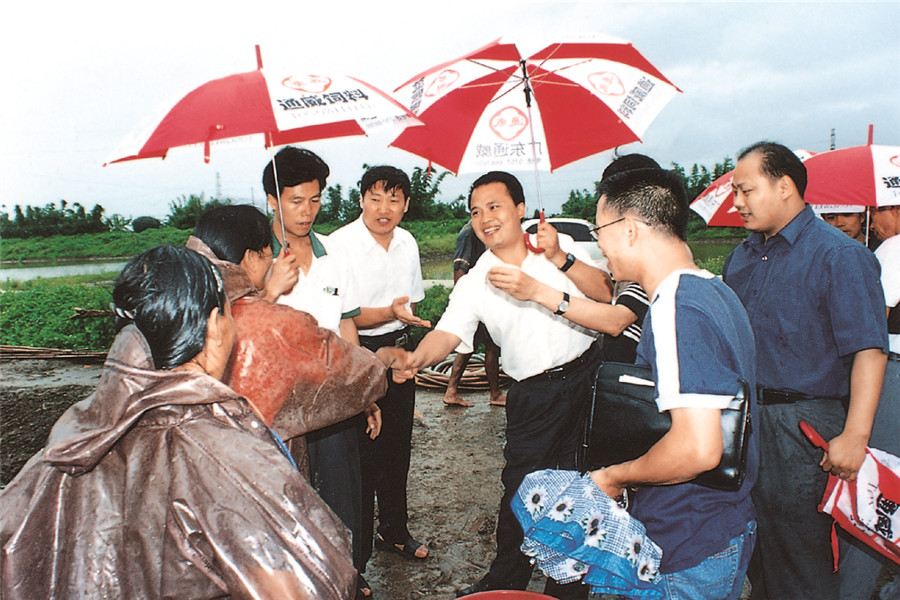 ▲2002年,劉漢元主席在廣東通威冒雨看望養殖戶