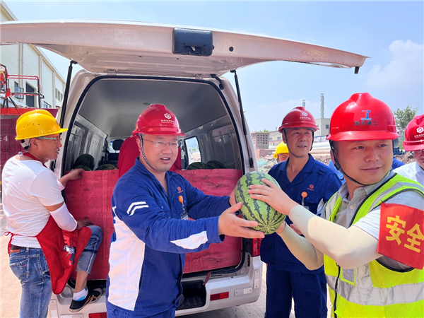 與此同時,永祥多晶硅公司總經理劉逸楓,永祥光伏科技公司總經理袁中華都帶領各部門負責人一起深入所轄公司生產一線,為戰斗在一線的干部員工、新員工、施工單位送去公司的問候與關懷。一箱箱清涼飲品、一顆顆大西瓜都包含著公司對全體員工的關懷。員工們收到慰問,感恩之情溢于言表,紛紛表示堅守崗位,履職盡責,緊跟公司步伐,為全面完成年度挑戰目標加油!