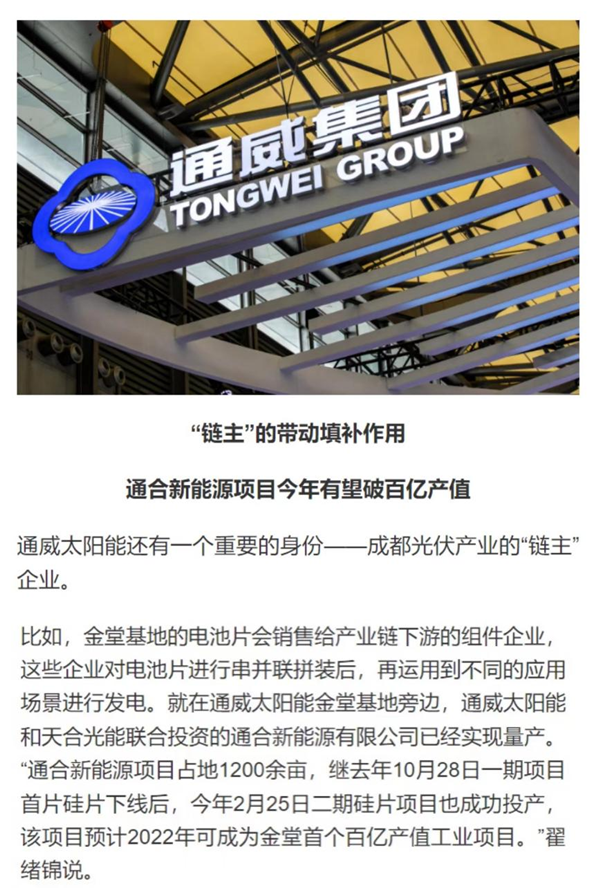報道指出,“如果把目光擴大到成都乃至整個四川,不難發(fā)現(xiàn),以雙流和金堂為核心承載,以通威太陽能等企業(yè)為代表的千億級光伏產(chǎn)業(yè)集群正初露崢嶸;通威太陽能還有一個重要的身份——成都光伏產(chǎn)業(yè)的“鏈主”企業(yè)。來自成都市生態(tài)環(huán)境局的數(shù)據(jù)顯示,目前成都光伏產(chǎn)業(yè)規(guī)模已近200億元,以雙流和金堂為核心承載,集聚通威太陽能等20余家重點企業(yè)?!眻蟮缹νㄍ柲芗せ罹G色動能,發(fā)揮光伏行業(yè)領(lǐng)頭羊的虹吸作用,加快發(fā)展綠色低碳產(chǎn)業(yè)集群表示高度肯定。