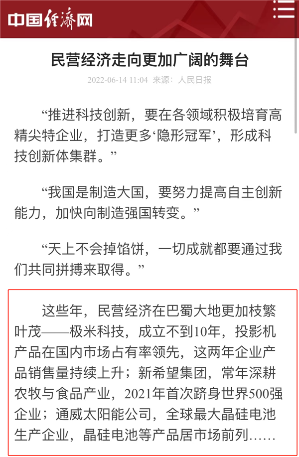 6月14日,人民網(wǎng)、人民資訊、中國(guó)經(jīng)濟(jì)網(wǎng)以“民營(yíng)經(jīng)濟(jì)走向更加廣闊的舞臺(tái)”為題,聚焦通威太陽(yáng)能助力地區(qū)經(jīng)濟(jì)發(fā)展。