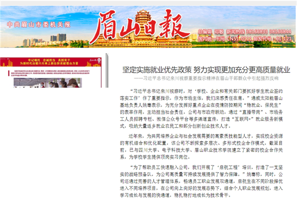 615日,眉山網、眉山日報發表題為《堅定實施就業優先政策 努力實現更加充分更高質量就業》的報道,聚焦通威太陽能眉山基地助力勞動者高質量就業。