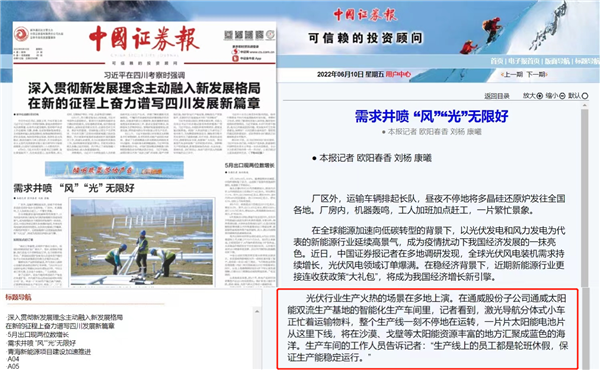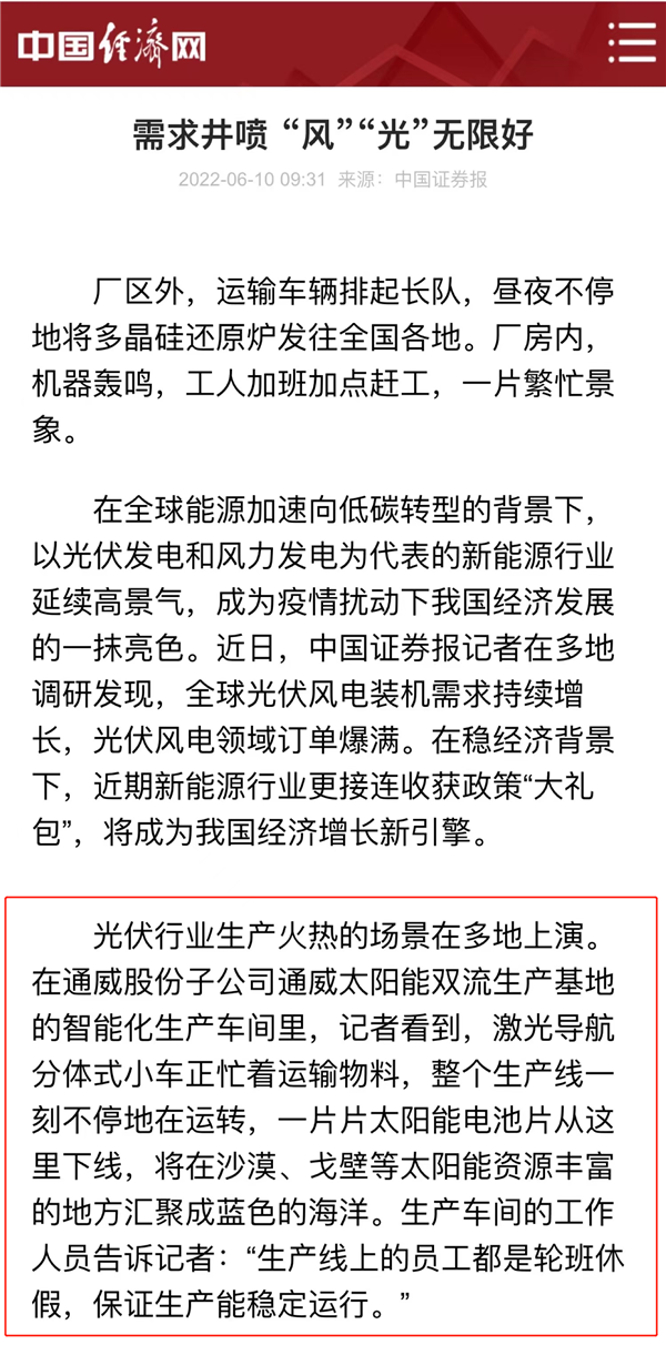 6月10日,人民資訊、中國經(jīng)濟網(wǎng)、中國證券報等主流媒體先后以《需求井噴 “風(fēng)”“光”無限好》為題,聚焦通威太陽能雙流基地高質(zhì)量發(fā)展。