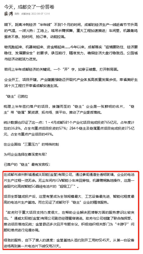 澎湃新聞在題為“今天,成都交了一份答卷”和“精準發力!公園城市經濟動能活力迸發”兩篇報道中先后對通威太陽能金堂基地項目加速度高質量發展進行聚焦,報道指出,在成都市淮州新城通威太陽能(金堂)有限公司,通過參觀通道全透明玻璃,企業的電池片生產過程一覽無余。無塵車間內IGV智能小車來回穿梭,機器臂嫻熟地操作,這是一座現代化高效智能5G晶硅電池片的“超級工廠”。項目全部建成投產后,這里有望成為全球規模最大、工藝設備最先進、智能化程度最高的電池片生產基地……金堂基地從簽約到開工用時僅45天,從第一臺設備進場再到第一片電池片下線僅用20天。