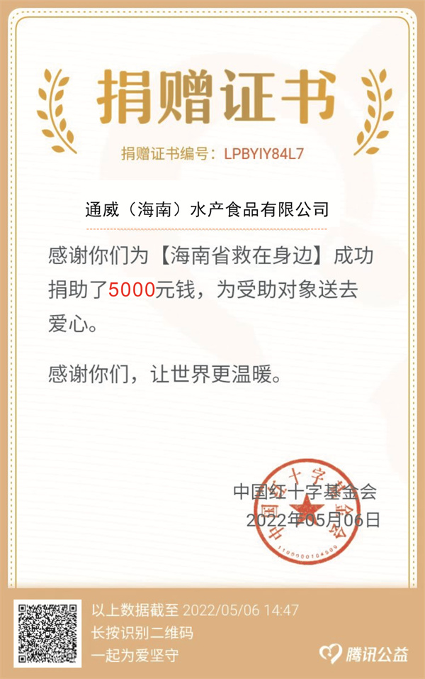 5月7日,海南水產(chǎn)食品人行部副經(jīng)理陳華偉代表公司參加2022年“5.8人道公益日眾籌項(xiàng)目募捐啟動(dòng)儀式”并現(xiàn)場(chǎng)捐贈(zèng)5000元,用于助力“海南省重癥地貧患兒救助”、“大病兒童人道需求關(guān)懷”和“安心社區(qū)”三個(gè)項(xiàng)目的建設(shè)。
