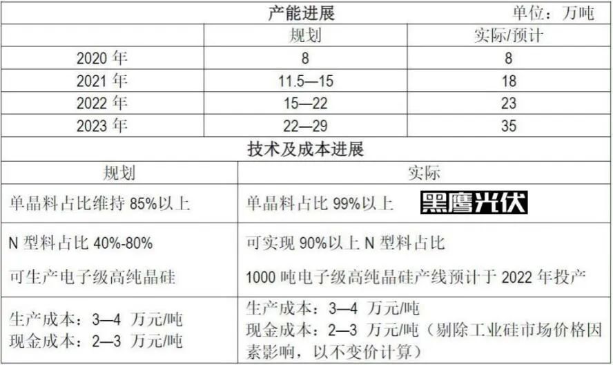 具體到高純晶硅業(yè)務:根據公司實際施情況,2021年底公司已累計建成18萬噸高純晶硅產能,順利完成2020 —2021年階段性產能目標;在建的包頭二期 5萬噸以及樂山三期12萬噸項目預計將分別于2022年、2023年投產,屆時公司高純晶硅能規(guī)模達到35萬噸 ,綜合目前技術、成本指標情況,公司將超額完成四年中期規(guī)劃目標,情況如下: