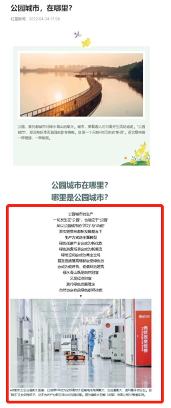 同時,紅星新聞在系列報道中重點聚焦通威太陽能綠色發展,報道中提到,“成都本土企業通威太陽能,已連續6年成為全球高效太陽能電池規模最大、出貨量最大、盈利最多的企業。在“鏈主”企業的帶動下,眾多光伏產業新主體紛紛搶灘成都。”報道對通威太陽能積極踐行綠色發展工作成效及發揮鏈主企業帶動作用表示高度認可。