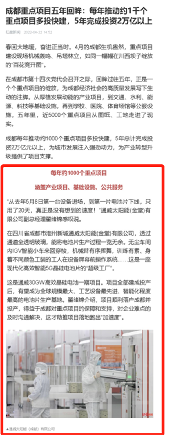 紅星新聞在回顧成都五年重點項目建設的報道中指出,“通過全透明玻璃的參觀通道,企業的電池片生產過程一覽無余。無塵車間內IGV智能小車來回穿梭,機械臂有序揮舞,訓練有素、身著不同顏色工裝的工人在設備屏幕前操作系統……這是一座現代化高效智能5G晶硅電池片的“超級工廠”。項目全部建成投產后,有望成為全球規模最大、工藝設備最先進、智能化程度最高的電池片生產基地。” 報道對通威太陽能項目建設加速度高質量發展給予高度評價。