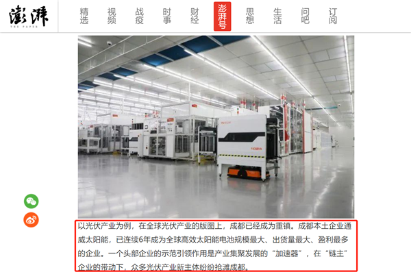 成都日報、澎湃新聞指出,“成都本土企業(yè)通威太陽能,已連續(xù)6年成為全球高效太陽能電池規(guī)模最大、盈利最多的企業(yè)。一個頭部企業(yè)的示范引領(lǐng)作用是產(chǎn)業(yè)集聚發(fā)展的“加速器”,在“鏈主”企業(yè)的帶動下,眾多光伏產(chǎn)業(yè)新主體紛紛搶灘成都?!眻蟮缹νㄍ柲茉诔啥冀ㄈ婃溞袆又?,所持續(xù)發(fā)揮的頭部示范引領(lǐng)作用給予高度評價。