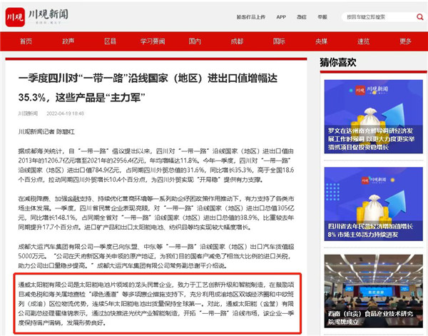4月19日,人民資訊、川觀新聞、四川在線等媒體聚焦通威太陽(yáng)能金堂基地產(chǎn)品出口量,獲贊外貿(mào)出口“主力軍”。