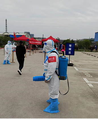 演練過程中,項目部兩名秩序維護員變身“大白”,指引員工按照步驟有序進行檢測,環境維護員背起10L消毒箱對演練區域進行循環消殺,工程維護員搬運現場防疫物資……參加演練的通宇物業員工積極主動,為本次演練做好了服務保障工作。在項目全員的后勤保障下,通威太陽能合肥基地員工自覺保持1米以上安全距離,有序進行檢測,確保了此次演練取得良好效果。