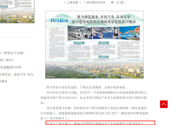 《人民日報》生動描繪了通威太陽能眉山基地熱火朝天的全線生產情況。