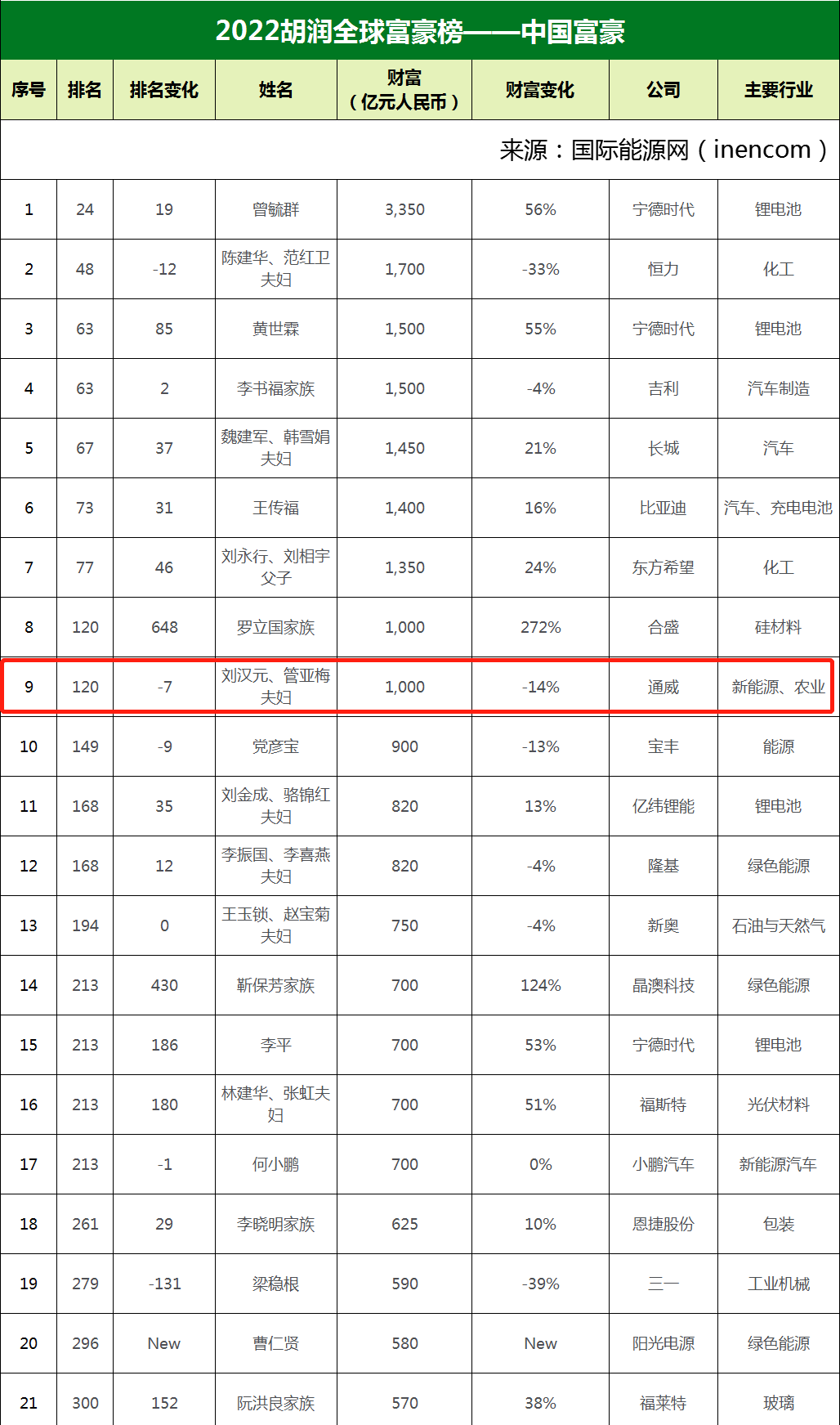 3月17日,胡潤研究院發(fā)布《2022胡潤全球富豪榜》。這是胡潤研究院連續(xù)第十一年發(fā)布“全球富豪榜”。今年共有來自69個國家2558家公司的3381位十億美金企業(yè)家上榜。其中,全國人大代表、全國工商聯(lián)副主席、通威集團董事局劉漢元主席,通威集團管亞梅董事長榮列榜單第120位。