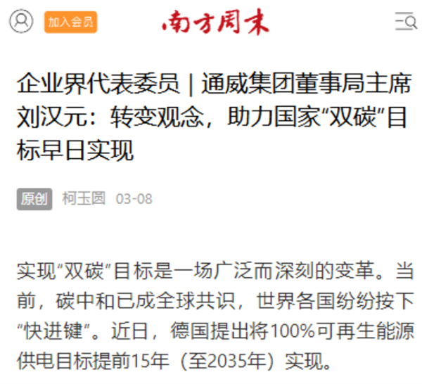 3月8日,南方周末以《企業界代表委員 | 通威集團董事局主席劉漢元:轉變觀念,助力國家“雙碳”目標早日實現》為題推出劉漢元主席兩會專訪。劉漢元主席在專訪中表示,“雙碳”目標利好整個光伏行業,但發展中也面臨亟待解決的瓶頸問題。觀念問題依然是最大的問題。事實上,只要我們認識到、看到這是一種必然的要求和未來的現實,那么在政策、措施、產業發展、技術等方面都能找到解決方案。從研究和思考角度來看,無論是儲能、新的電網建立,還是相關產業轉型,已經有很多可行的、經濟的方案擺在行業面前,可以去實施、去實踐。