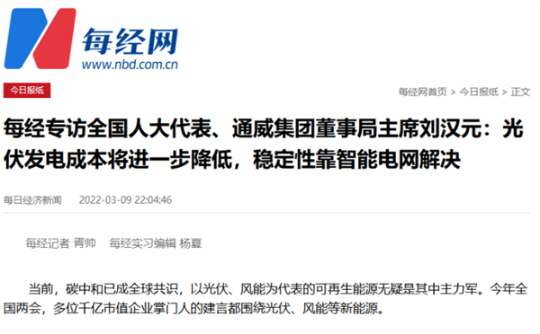 3月9日,每日經濟新聞發布《每經專訪全國人大代表、通威集團董事局主席劉漢元:光伏發電成本將進一步降低,穩定性靠智能電網解決》專訪。在專訪中,劉漢元主席表示,根據專業研究,碳中和將是未來最大的經濟市場。這意味著工業革命以來建立的化石能源體系,在未來30~40年要實現全面轉變,變成可持續發展的再生能源體系,用20年、30年實現二三百年能源的升級換代,這既是全人類的進步,更是巨大的商機。