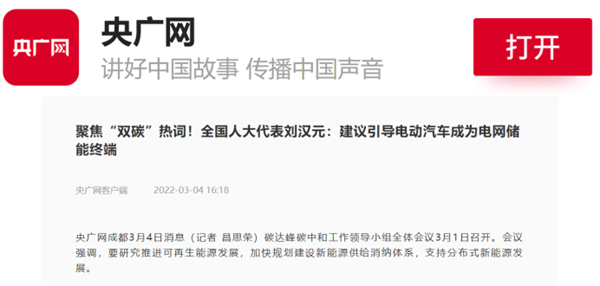 3月4日,央廣網客戶端推出《聚焦“雙碳”熱詞!全國人大代表劉漢元:建議引導電動汽車成為電網儲能終端》報道。報道中,劉漢元主席分享了電動汽車作為儲能單元的構想,并表示,隨著我國電動汽車數量大幅增長,將電動汽車作為分布式儲能單元接入系統,除運行時間以外,大部分時間在線,成為電網儲能、微網儲能、小區儲能、家用儲能的一部分。電網負荷高時向電網反向售電,負荷低時存儲電網過剩電量,在為電網作出貢獻的同時,以市場化機制通過充放電的價差獲得相應收益,從而降低購買整車或電池包的成本,實現電動車和電網的良性互動。這不僅能有效提升電網效率,減少供電損耗,大幅提高閑置資源使用率,還能進一步強化可再生能源使用場景,提升可再生能源利用率,助力雙碳目標落地。此外,電網的智能化改造還將拉動相應投資。