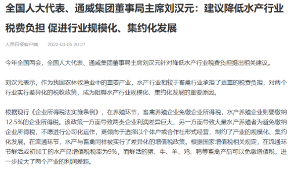 3月5日,人民日報客戶端以《全國人大代表、通威集團董事局主席劉漢元:建議降低水產行業稅費負擔 促進行業規?;?、集約化發展》為題推出報道。劉漢元主席在報道中表示,作為我國農林牧漁業中的重要產業,水產行業相較于畜禽行業承擔了更重的稅費負擔,對兩個行業實行差異化的稅收政策,成為阻礙水產行業規?;⒓s化發展的重要原因。對水產和畜禽行業一視同仁、公平對待,調整欠合理的稅收政策,營造公平的稅收環境已迫在眉睫。由此,才能破除制約水產行業發展的政策“枷鎖”,真正推動行業向現代化、規模化、集約化、標準化發展,推動整個產業高質量發展。