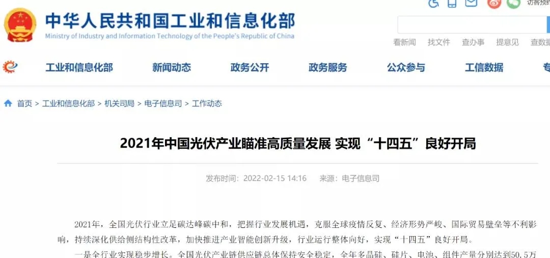 工信部:2021年中國光伏產業瞄準高質量發展 實現“十四五”良好開局