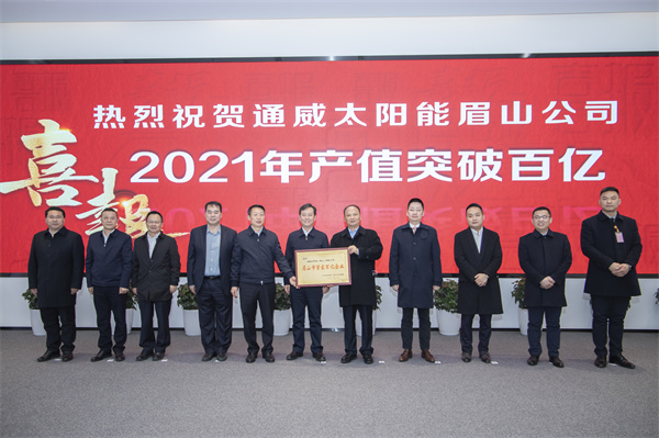 2020年4月,一期項目建成投產(chǎn),二期7.5GW高效晶硅電池項目同步開工;2021年2月,二期項目第一張電池片正式下線;2021年,通威太陽能眉山公司產(chǎn)值突破百億元大關(guān)。