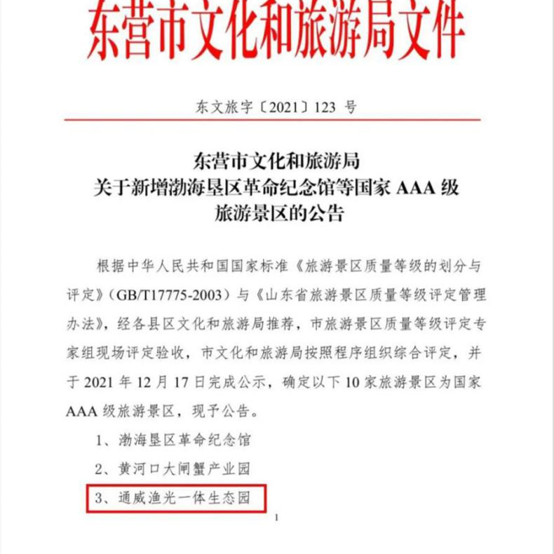近日,東營市文化和旅游局公布了全市新增國家AAA級旅游景區名單,通威東營漁光一體生態園成功評定為國家AAA級旅游景區,這是繼2019年黃河口知青小鎮獲批國家AAA級景區以來東營市墾利區第二家AAA級旅游景區。
