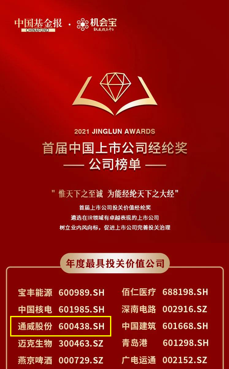 12月8日,由中國(guó)基金報(bào)聯(lián)合權(quán)威投關(guān)平臺(tái)機(jī)會(huì)寶,共同舉辦的首屆中國(guó)上市公司投關(guān)價(jià)值經(jīng)綸獎(jiǎng)評(píng)選榜單重磅揭曉。通威憑借在公司規(guī)范運(yùn)作治理、信息披露和投資者關(guān)系管理等方面工作的卓越表現(xiàn),榮膺“2021年度最具投關(guān)價(jià)值公司”。