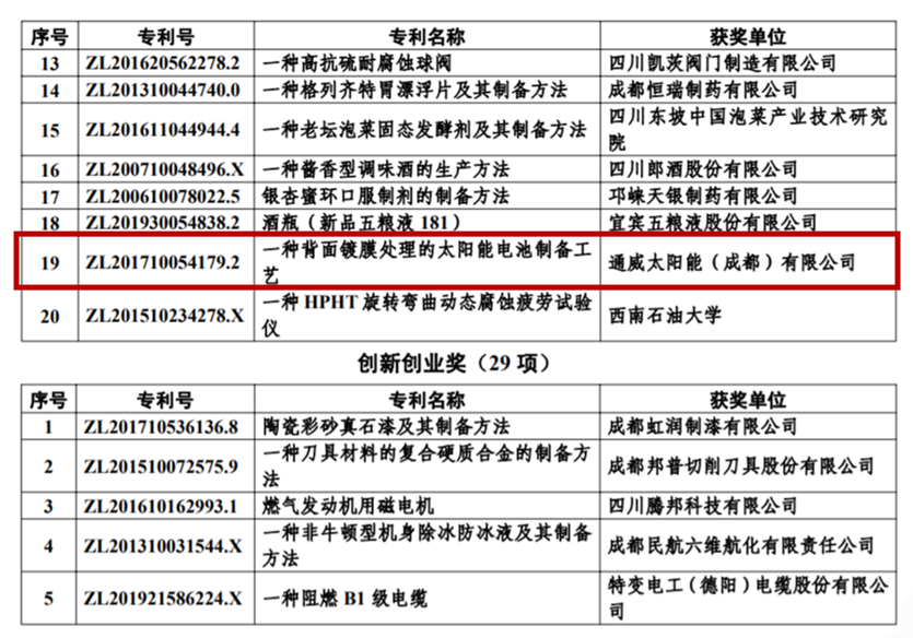 11月23日,四川省政府網站發布了《四川省人民政府關于2020年度四川專利獎授獎的決定》。通威太陽能雙流基地申報項目“一種背面鍍膜處理的太陽能電池制備工藝”榮獲2020年度四川專利獎三等獎。