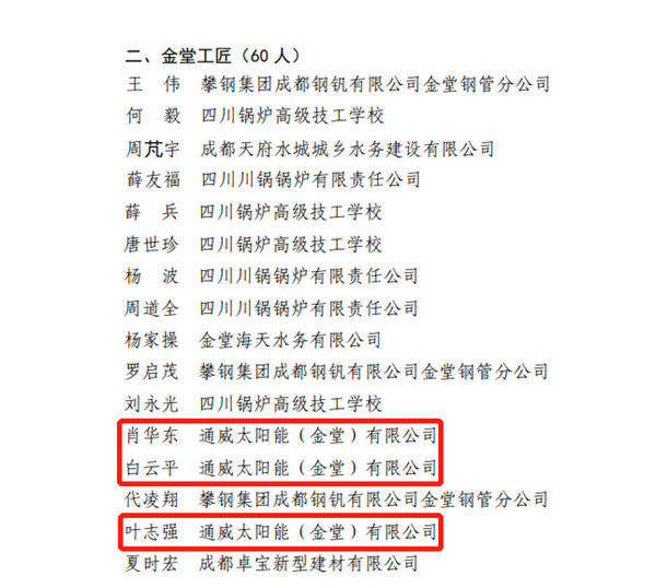 近日,中共金堂縣委組織部、金堂縣總工會(huì)公示了《“關(guān)于授予伍玉松等10名同志“金堂十佳工匠”稱(chēng)號(hào) 授予王偉等60名同志“金堂工匠”稱(chēng)號(hào)的通知”》。通威太陽(yáng)能金堂基地劉香飛、肖華東、白云平、葉志強(qiáng)四名員工在工藝專(zhuān)長(zhǎng)、技藝精湛、專(zhuān)業(yè)敬業(yè)方面表現(xiàn)突出,獲評(píng)“金堂工匠”榮譽(yù)稱(chēng)號(hào),其中劉香飛榮獲“金堂十佳工匠”榮譽(yù)稱(chēng)號(hào)。