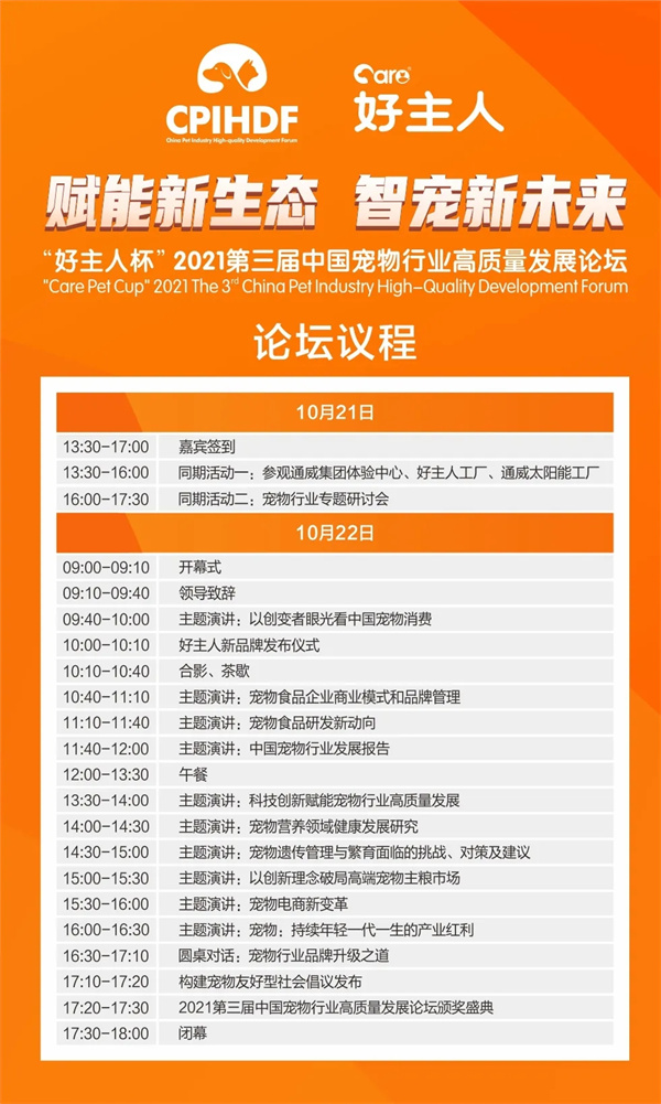 10月22日,由好主人寵物食品全程支持的2021第三屆中國(guó)寵物行業(yè)高質(zhì)量發(fā)展論壇將于成都通威國(guó)際中心隆重舉行。大會(huì)將圍繞“賦能新生態(tài) 智寵新未來(lái)”主題,攜手行業(yè)協(xié)會(huì)、專家學(xué)者、領(lǐng)軍企業(yè)、kol等,深度聚焦中國(guó)寵物行業(yè)面臨的機(jī)遇與挑戰(zhàn),激發(fā)我國(guó)寵物行業(yè)發(fā)展的全新動(dòng)能。