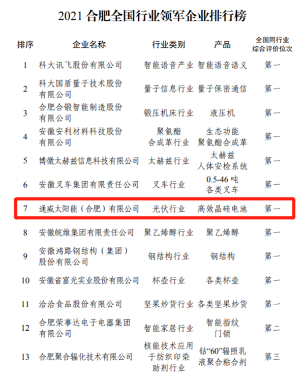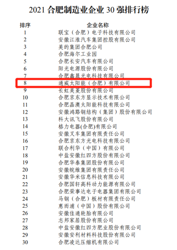 通威太陽能合肥基地榮列2021合肥企業50強、合肥制造業企業30強、合肥全國行業領軍企業榜單