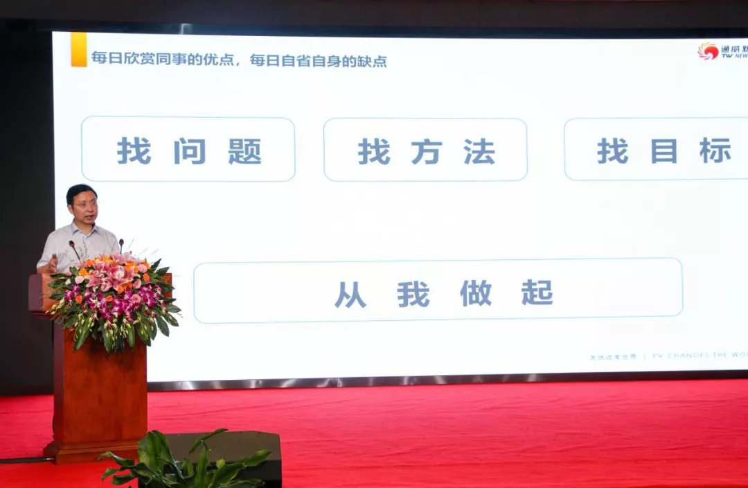 會議現場 會議在雄壯激昂的《通威之歌》中拉開帷幕。邱總圍繞光伏終端板塊2021半年度管理干部民主測評結果及相關問題,進行了有針對性的闡述,并指出,明確經營目標、加強執行力建設是新能源的兩大重點工程,項目營銷、工程建設則是公司良性經營發展的兩大支柱。在上述工作開展過程中,要迅速行動,周密部署,成立強而有力的團隊,不斷強化組織領導,整合各業務條線力量,明確網格責任,推動相關工作扎實有效開展。各職能部門和各業務公司要履行好統籌協調責任,協同作戰、合力推進。要在實踐中不斷完善管理體系、提升管理能力,總結經驗和方法,精準施策,不斷提升管理效能。必須堅定員工對公司市場戰略的信心,進一步勾畫公司發展藍圖,分享管理思路落地過程中存在的問題及解決方案,提升全員責任意識、全局觀、服務意識、合作意識并形成合力,全力以赴為完成全年目標任務拼搏。 通威新能源執行董事兼總經理邱艾松發言 楊總圍繞近期開展的“找問題、找方法、找目標”活動(以下簡稱“三找”活動),深度剖析了目前公司在思想認識、組織架構及權責劃分、制度流程、團隊建設和績效考核、執行力和效率提升等方面亟待解決的問題和需要完善的環節。 隨后,各小組就實際工作中的痛點、難點問題進行了熱烈討論。大家一致認為,“工作無小事”,要摒棄復雜、不合理的工作方式,懂得尋找問題、發現利弊、突破固有思維、創新升級、提高工作效率并提升服務質量,才能真正把工作做到實處、細處,助力公司經營目標的達成。 會議期間,陳總從行業發展和政策導向等角度分析了“十四五”期間通威新能源面臨的機遇和挑戰,同時展示了2021行業相關數據,并指出,光伏產業邁入平價時代,政策密集引導行業高質量健康發展。在“碳達峰、碳中和”的目標下,光伏行業被賦予了高增長、高景氣度的成長空間。在行業競爭日益激烈的態勢下,既有壓力,也要抓住時機,找準切入點,在項目開發過程中看清楚自身優勢,腳踏實地,真正把每個項目落到實地,爭取更大的勝利。 通威股份光伏事業部總裁陳星宇作政策分享 謝董點評通威新能源相關工作時指出,通威新能源各級領導干部在日常工作中,必須要深入一線,真實了解一線心聲。民主測評是管理方式之一,大家必須要正視自身的不足,少找理由和借口。“三找”活動形式很好,但這只是一個開端,后續要結合公司的經營管理需要,按照主次,對活動中發現的問題進行分類,用清單管理形成任務書,落實責任人,集中力量解決內部問題。劉漢元主席明確指出:“企業文化是通威的第三大核心優勢,在這個過程當中,我們始終強調表率是最好的領導方法,沒有之一是最好。管理者首先要率先垂范,身先士卒,要求員工做到的自己率先做到,要以拿下一座山頭就是英雄的氣概帶領團隊打勝仗。管理者要將自身打造為執行力標桿,并且為每一個行為去維護你所倡導的企業文化,做好表率,最大限度調動廣大員工的積極性、主動性、創造性,營造比學趕超的氛圍,鼓勵大家共同奮進。”希望大家會后再次仔細研讀劉主席的講話精神,并在實際工作中貫徹執行。 通威股份董事長謝毅作工作指示 謝董表示,有問題不要怕,大家發現了問題,一起來解決問題,就會事半功倍。先做強,再做大,這樣的“強大”才是有意義的。通威新能源全員要進行季度任務分解和落實,確定目標,理清楚,想清楚,執行到位。上下一心,擰成一股繩,打造一支有作戰能力的團隊,齊心協力、大刀闊斧地向著共同的目標奮進,扛起大旗,養好“陽光魚”,打一場漂亮的大勝仗!