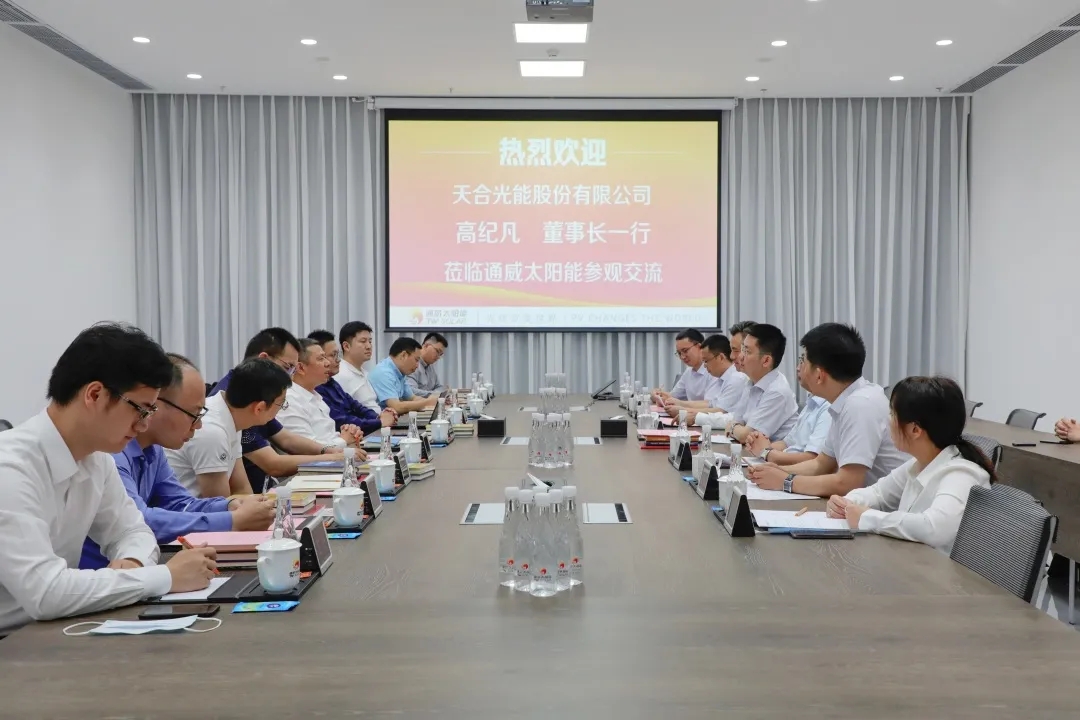 高紀(jì)凡董事長(zhǎng)、謝毅董事長(zhǎng)聽取通合新能源項(xiàng)目建設(shè)情況介紹 在通合新能源項(xiàng)目建設(shè)現(xiàn)場(chǎng),高紀(jì)凡董事長(zhǎng)詳細(xì)聽取了項(xiàng)目建設(shè)進(jìn)度、技術(shù)水平、配套設(shè)施等情況的介紹,并走進(jìn)通威太陽(yáng)能金堂基地A1展廳、智能制造電池生產(chǎn)車間,實(shí)地查看生產(chǎn)線運(yùn)行、產(chǎn)品產(chǎn)出、5G工業(yè)化運(yùn)用、智能制造等情況。座談會(huì)上,雙方回顧了過往的合作情況,就生產(chǎn)內(nèi)容、光伏產(chǎn)業(yè)技術(shù)路線、合資項(xiàng)目建設(shè)進(jìn)度、行業(yè)市場(chǎng)動(dòng)態(tài)等內(nèi)容進(jìn)行了深度探討。 參觀通威太陽(yáng)能金堂基地A1展廳 高紀(jì)凡董事長(zhǎng)對(duì)通合新能源項(xiàng)目建設(shè)情況給予充分肯定,對(duì)合作前景充滿信心,并表示,希望未來雙方繼續(xù)保持溝通交流,進(jìn)一步深化優(yōu)勢(shì)互補(bǔ)和產(chǎn)業(yè)聯(lián)合的合作關(guān)系,攜手做大做強(qiáng),共同構(gòu)建互利共享、協(xié)同發(fā)展的產(chǎn)業(yè)生態(tài)典范,為社會(huì)創(chuàng)造更大效益。 座談交流現(xiàn)場(chǎng) 謝毅董事長(zhǎng)表示,下一步將穩(wěn)步推進(jìn)通合新能源項(xiàng)目建設(shè)工作,希望雙方繼續(xù)秉承緊密協(xié)同的合作精神,利用各自優(yōu)勢(shì),攜手攻克建設(shè)難關(guān),共促新項(xiàng)目早日達(dá)成,共創(chuàng)雙贏發(fā)展局面,為行業(yè)提供優(yōu)質(zhì)高性價(jià)比產(chǎn)品,攜手推動(dòng)光伏行業(yè)健康穩(wěn)定發(fā)展。 合影留念