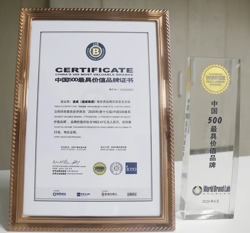 8月5日,由世界品牌實(shí)驗(yàn)室主辦的2020年第十七屆世界品牌大會(huì)在北京舉行。通威品牌價(jià)值正式突破1000億元大關(guān),達(dá)1002.67億元,創(chuàng)下歷史新高,成為全球水產(chǎn)和光伏兩大行業(yè)首個(gè)品牌價(jià)值破千億的企業(yè)!通威榮列2020年《中國(guó)500最具價(jià)值品牌》百?gòu)?qiáng)排行榜,位列53位。