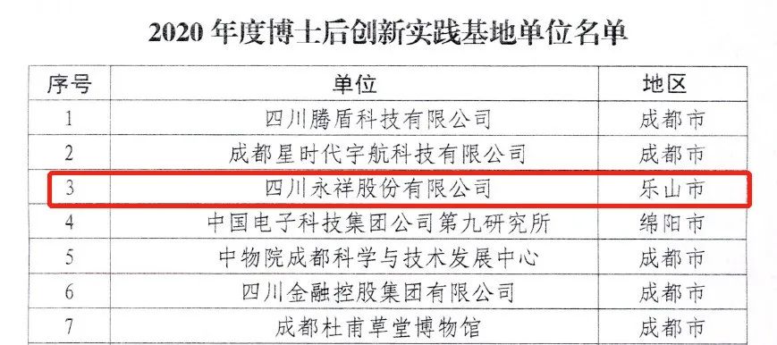 8月4日,四川省人力資源和社會保障廳正式發布《關于批準設立2020年博士后創新實踐基地的通知》,批準2020年全省25家知名企業成立博士后創新實踐基地,永祥股份榮列其中。博士后創新實踐基地的建立,完善了公司技術自主創新主體,標志著永祥股份科技人才建設、技術研發工作邁上嶄新里程碑。