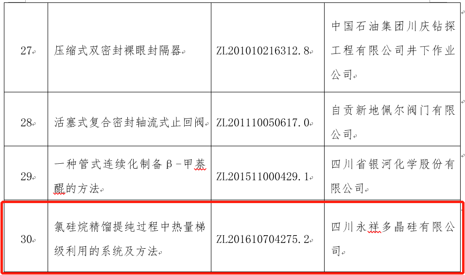 近日,四川省知識產權服務促進中心發布了2019年度四川省專利獎評審公告,四川永祥多晶硅有限公司發明專利“氯硅烷精餾提純過程中熱量梯級利用的系統及方法”榮獲本次四川省專利獎創新創業獎。