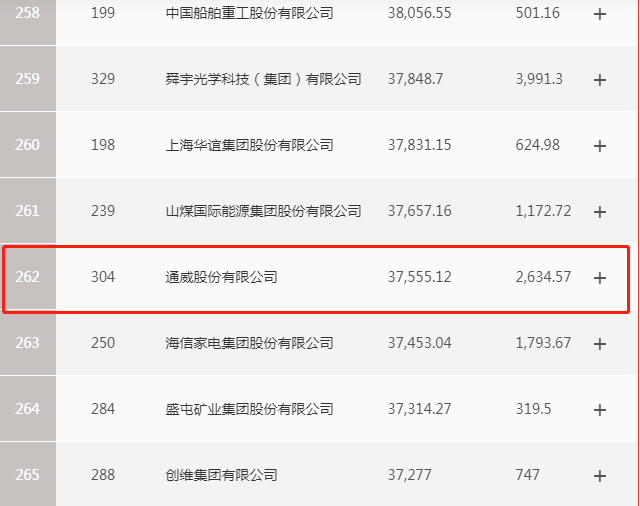 該榜單由《財富》(中文版)與中金公司財富管理部合作編制。今年500家上榜的中國上市公司總營業收入達到50.5萬億元人民幣,較去年增長11%;凈利潤達到了4.2萬億元,較去年增長超16%。今年上榜公司的年營收門檻接近178億元,相比去年提升了近10%。去年中國GDP突破99萬億元,這意味著榜上500家上市公司的收入總和仍然超過了中國當年GDP的一半。通威股份以375.55億元營收榮列榜單第262位,較去年上升42位。