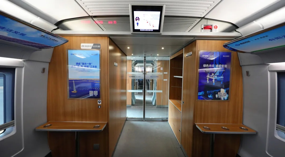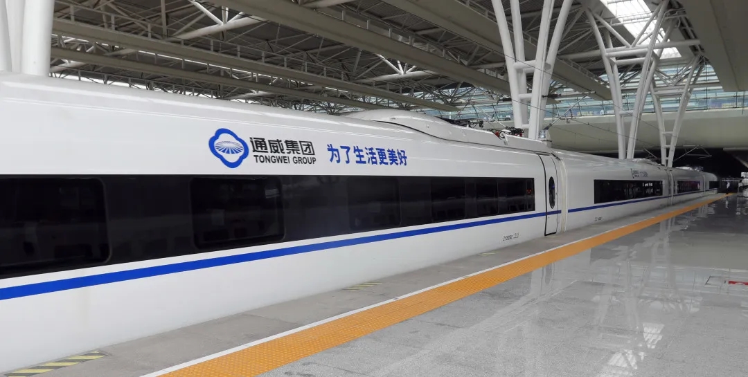 在儀式現(xiàn)場(chǎng),“通威號(hào)”高鐵專列整裝待發(fā)。車廂內(nèi)外,“通威 為了生活更美好”的企業(yè)標(biāo)識(shí)貫穿全車,車廂內(nèi)展示了通威新能源產(chǎn)業(yè)發(fā)展成果以及綠色發(fā)展理念。