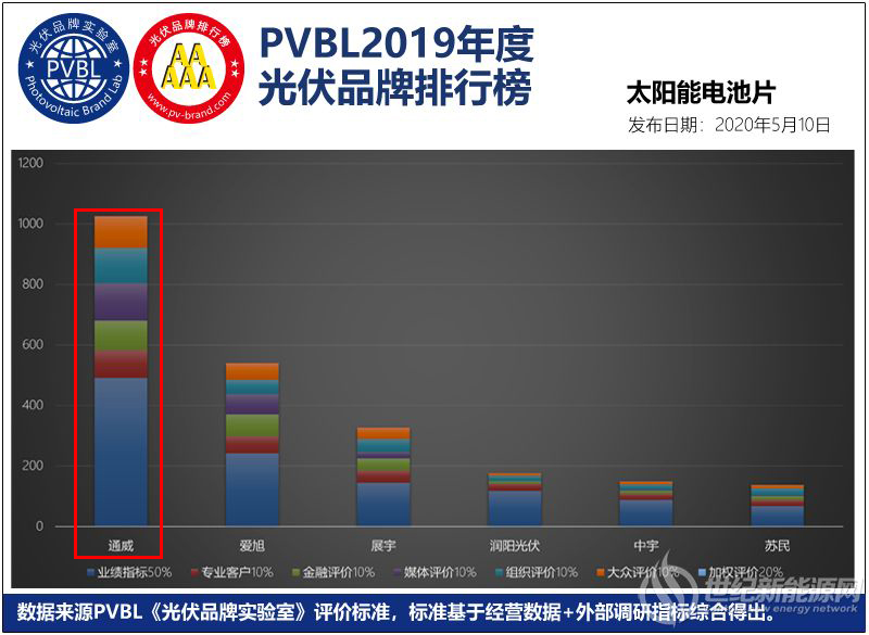 通威太陽(yáng)能榮登“PVBL2019光伏品牌排行榜”電池片排行榜榜首 “PVBL中國(guó)光伏品牌排行榜”創(chuàng)建于2012年,是中國(guó)唯一一個(gè)以評(píng)價(jià)光伏品牌價(jià)值的調(diào)研排名榜單,被譽(yù)為“中國(guó)光伏市場(chǎng)晴雨表”。榜單優(yōu)先考察參評(píng)品牌(企業(yè))的年度出貨、營(yíng)收、科研、影響、服務(wù)5個(gè)一級(jí)指標(biāo),同時(shí)綜合測(cè)評(píng)品牌知名度、品牌美譽(yù)度、品牌忠誠(chéng)度、社會(huì)責(zé)任、行業(yè)影響、社會(huì)影響等10個(gè)二級(jí)指標(biāo)。榜單已連續(xù)發(fā)布七屆,在業(yè)內(nèi)具有極高的權(quán)威性和公信力。 PVBL2019年度光伏品牌價(jià)值排行榜(總榜) 此次“PVBL2019光伏品牌排行榜”電池片排行榜,通威太陽(yáng)能從業(yè)績(jī)指標(biāo)、專(zhuān)業(yè)客戶(hù)、金融評(píng)價(jià)、媒體評(píng)價(jià)等評(píng)分指標(biāo)遠(yuǎn)超榜單第二名企業(yè)近乎一倍,這不僅展示了通威太陽(yáng)能過(guò)硬的整體實(shí)力,更是社會(huì)各界對(duì)通威品牌的信任,也是對(duì)通威太陽(yáng)能產(chǎn)品品質(zhì)和服務(wù)品質(zhì)的高度認(rèn)可與肯定。此前,光伏產(chǎn)業(yè)權(quán)威分析機(jī)構(gòu)PV InfoLink公布的2019年電池片出貨排名中,通威太陽(yáng)能以單晶PERC電池片年出貨量超過(guò)10GW的總出貨量遙遙領(lǐng)先其他廠家,穩(wěn)居第一的寶座,這也是通威太陽(yáng)能自2017年首次榮登該電池片出貨量榜首以來(lái)的3年連冠。 PVBL2019年度光伏品牌排行榜(太陽(yáng)能電池片) 自成立以來(lái),通威太陽(yáng)能持續(xù)加強(qiáng)在電池片環(huán)節(jié)的研發(fā)、制造與推廣,不斷刷新光伏行業(yè)新紀(jì)錄,受到了行業(yè)內(nèi)外的高度關(guān)注和廣泛贊譽(yù),先后斬獲“第七屆中國(guó)綠效企業(yè)最佳典范獎(jiǎng)”、“優(yōu)秀太陽(yáng)能電池供應(yīng)商品牌知名度排行榜第一”、“光伏電池智能制造行業(yè)領(lǐng)跑者”、“中國(guó)好光伏民族品牌獎(jiǎng)”、“維科杯·OFweek2019卓越光伏電池產(chǎn)品獎(jiǎng)”等諸多行業(yè)重磅榮譽(yù)。后期,通威太陽(yáng)能將以此榮登“PVBL2019光伏品牌排行榜”電池片排行榜榜首為契機(jī),持續(xù)鞏固光伏行業(yè)龍頭地位,引領(lǐng)行業(yè)健康可持續(xù)發(fā)展。