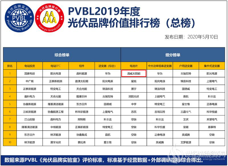 5月10日,第四個(gè)“中國(guó)品牌日”如約而至,由世紀(jì)新能源網(wǎng)、光伏品牌實(shí)驗(yàn)室聯(lián)合主辦的第五屆世紀(jì)光伏大會(huì)隆重發(fā)布“PVBL2019光伏品牌排行榜”,通威太陽(yáng)能作為光伏行業(yè)龍頭企業(yè),強(qiáng)勢(shì)榮登“PVBL2019光伏品牌排行榜”電池片排行榜榜首。