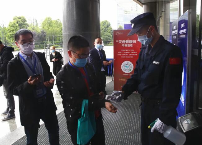 工作人員為參會嘉賓進行嚴格體溫檢測