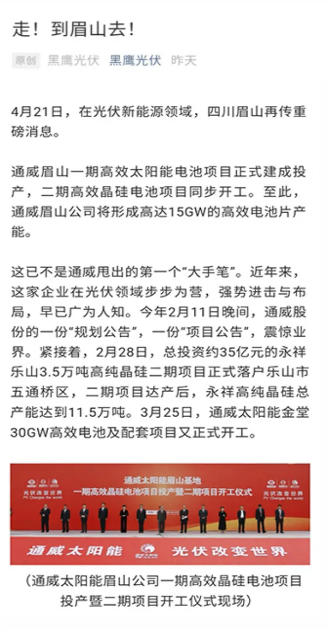 黑鷹光伏以“走!到眉山去!”為題解讀“通威速度”和“通威底氣”。報(bào)道指出,在助力治蜀興川同時(shí),眉山項(xiàng)目的建成投產(chǎn),也將為通威在全球新能源最新競(jìng)局中落下重筆。通威投資超百億的“眉山坐標(biāo)”,無疑成為通威新能源大棋局中不可或缺的重要一環(huán)。