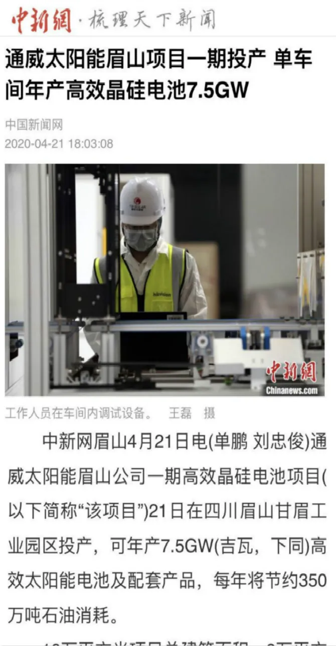 人民網(wǎng)、中新社深入解讀眉山項(xiàng)目助力地方經(jīng)濟(jì)發(fā)展,加速形成“成眉樂光伏產(chǎn)業(yè)經(jīng)濟(jì)帶”發(fā)展格局。報(bào)道指出,該項(xiàng)目從雙方開始接治到敲定投資僅用了36天,正式簽約僅用了50天,正式開工僅用了110天,從簽約到投產(chǎn),僅用了一年零三個(gè)月,創(chuàng)造了項(xiàng)目投資新的“通威速度”、“甘眉速度”、“中國(guó)速度”。