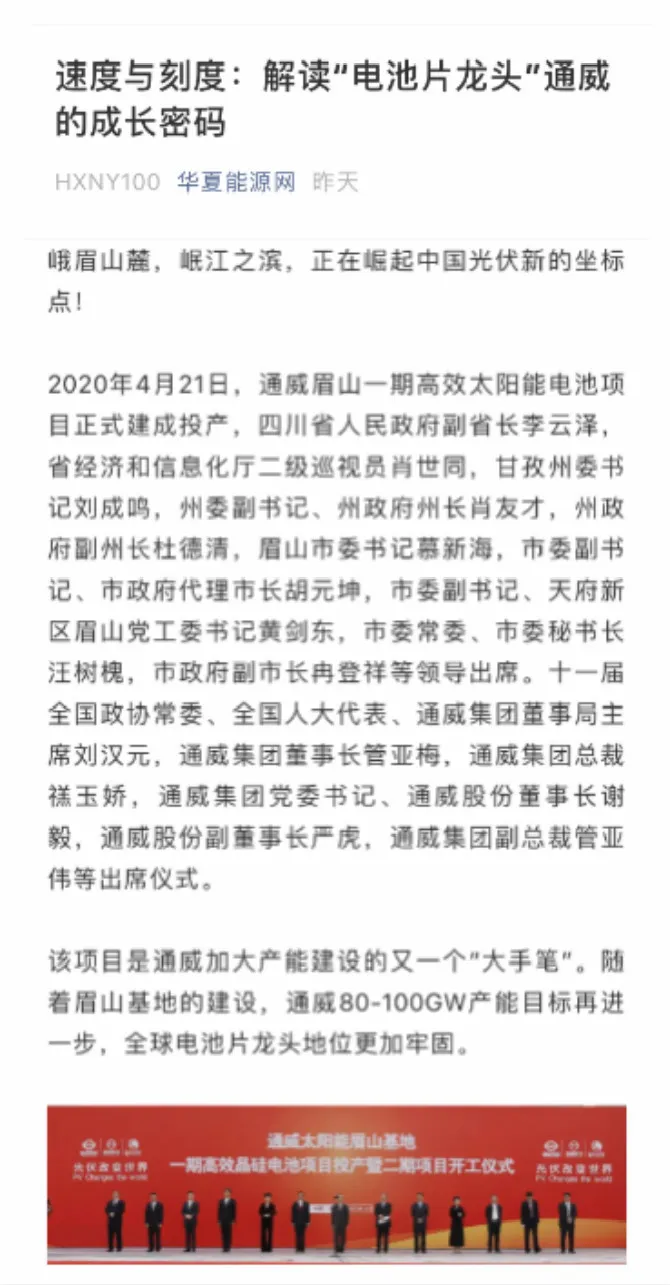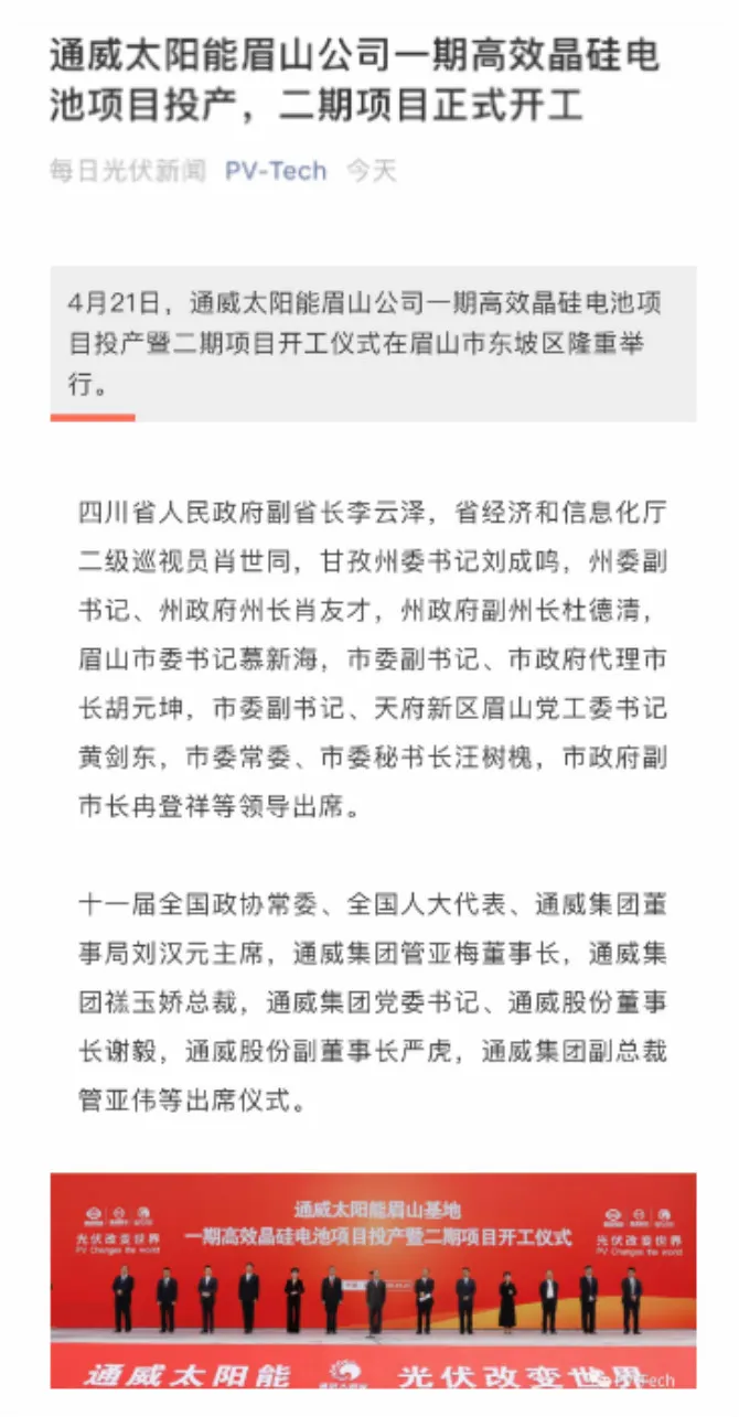 此外,新浪網(wǎng)、騰訊網(wǎng)、紅星新聞等主流媒體也競(jìng)相報(bào)道眉山公司一期高效晶硅電池項(xiàng)目投產(chǎn)及二期項(xiàng)目開工情況,深度聚焦眉山項(xiàng)目整體情況。通威太陽能眉山一期項(xiàng)目投產(chǎn)暨二期項(xiàng)目開工,將進(jìn)一步擴(kuò)大公司高效太陽能電池的產(chǎn)能規(guī)模,不斷鞏固并提升公司在全球太陽能電池行業(yè)的領(lǐng)先地位。作為全球新能源領(lǐng)域的龍頭企業(yè),通威太陽能將繼續(xù)不忘初心,砥礪前行,為實(shí)現(xiàn)“打造世界級(jí)清潔能源企業(yè)”的戰(zhàn)略目標(biāo)和“綠水青山就是金山銀山”的美好愿景砥礪奮進(jìn)!