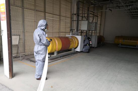 下午15時(shí),參與演練的所有成員提前集合,進(jìn)行桌面推演,確保演練有序進(jìn)行。16時(shí),演練正式開始。接到通知后,管制組立即管制現(xiàn)場(chǎng)、清點(diǎn)人數(shù)、組織現(xiàn)場(chǎng)疏散;支援組負(fù)責(zé)協(xié)調(diào)調(diào)集應(yīng)急器材及物資保障、做好其他現(xiàn)場(chǎng)救援支援工作、對(duì)進(jìn)入施救的人員進(jìn)行信息的確認(rèn),記錄時(shí)間、姓名、人數(shù),并確認(rèn)PPE穿著妥當(dāng)、撤出人員后物資清點(diǎn)、傷患救治等其他工作;確認(rèn)組確認(rèn)現(xiàn)場(chǎng)泄漏及人員滯留情況,泄漏對(duì)其他設(shè)備的影響情況;處理組進(jìn)行設(shè)備搶修、處置突發(fā)情況是否有未撤離人員、環(huán)境整理,并防止發(fā)生次生事故、消防處理。