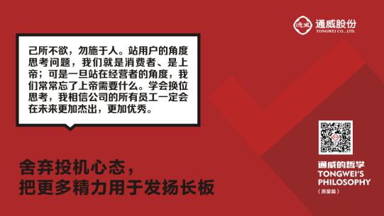 “養殖效益最大化”必須是發自內心的真話,必須成為每個通威人的行為準則。換個花樣就多賺用戶的錢,這都是短視的、小兒科的手段!不被浮云遮眼,才是一個高智商的企業與員工應該做的事情。要公道,打顛倒,站在用戶的角度上考慮問題,打開大門讓用戶把每個環節看完,回去依舊覺得通威是他的唯一選擇。任何時候要搞清楚,用戶的麻煩是企業的麻煩,企業的麻煩是用戶的麻煩,我們的合作就像在一條船上,額外花的錢、費的功夫、停的機器、浪費的工時、加工出來的次品,一定是共同買單。我賺不到錢,無法為你服務;我賺多了錢,明天你不讓我為你服務!我們的合作如果浪費太多時間和資源,我們的聯合就沒有意義,最終崩塌。”